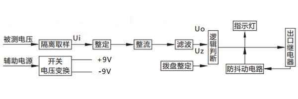 被測電壓經(jīng)過電阻分壓取樣,得到與被測電壓成比例的取樣電壓Ui , Ui經(jīng)撥盤整定,再進(jìn)行整流濾波,得到直流Uo ,邏輯回將Uo與門坎電壓Uz進(jìn)行比較。對欠電壓繼電器,若Uo> Uz ,則出口繼電器不動作;若Uo